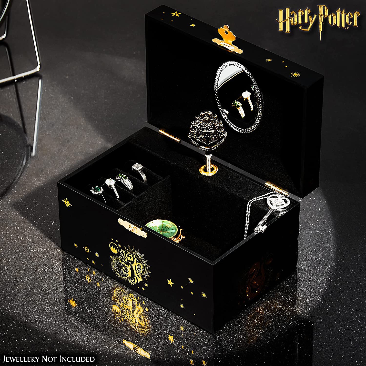 - Harry Potter Carillon Portagioie: Elegante portagioie musicale con decorazioni nere e oro e fodera in morbido velluto e spazio per gli anelli. Il cofanetto portagioie è dotato di uno stemma di Hogwarts altamente rifinito che fatto girare suona una simpatica melodia